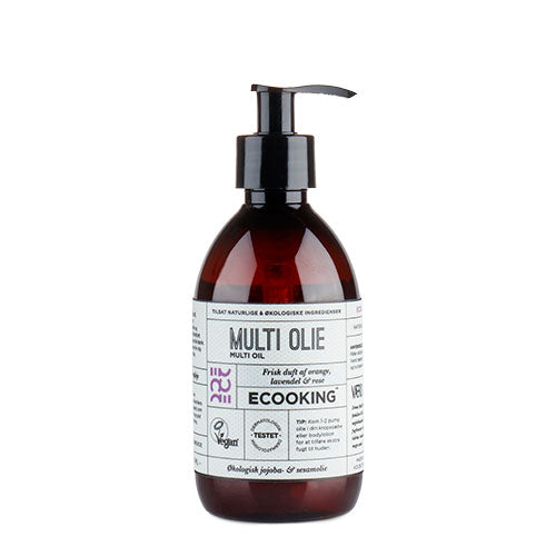 Ecooking multi olie er en unik og multifunktionel olie. Som består af 100 økologiske olier og essentielle duftudtræk af orange og lavendel. Som navnet antyder. Kan Ecooking Multi Olie anvendes til flere ting. Bl. A.. Hårkur. Hårolie. Barbering til både